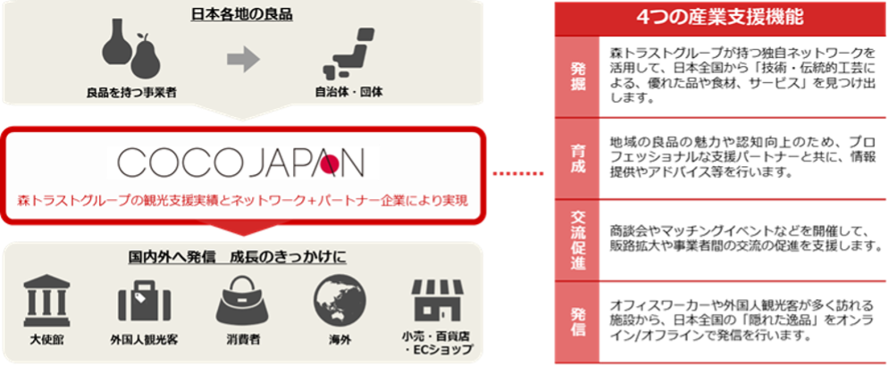 「CoCo JAPAN」は、森トラストグループが東京都港区にあるTOKYO WORLD GATE CoCo Loungeを拠点に、日本各地から魅力ある逸品を発掘し、国内外へと羽ばたくサポートを行うプロジェクトです。都心でのプロモーション機会の提供、森トラストグループのオフィスやホテル施設を利用したイベントの実施、商談会などの販路拡大や成長支援を通じて、日本全国の「隠れた逸品」を発信していきます。